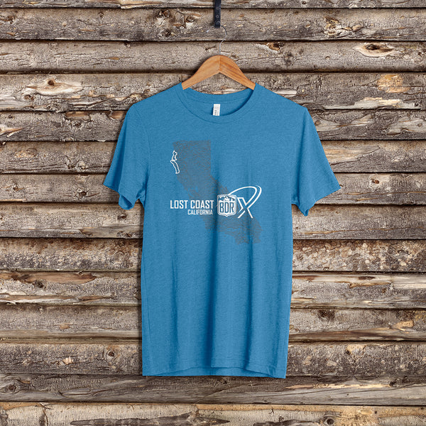 The official Lost Coast BDR-X route is traced in a bold, high-contrast line across a band of layered coastal and elevation-inspired artwork. Coastal inlets, ridgelines and elevation bands are rendered with crisp detail on the front. The back features a custom illustration by Lost Coast native Doug Werner.